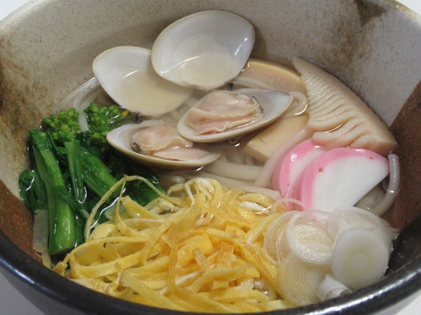 きょう麺料理は桃の節句にちなんで「はまぐりと菜の花のうどん」です