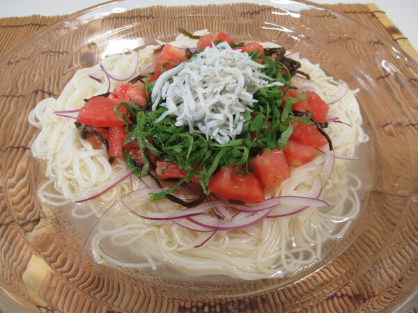 今日の麺料理は蒸し暑くなるこれからの季節にピッタリの「トマトとしらすの塩ダレそうめん」です
