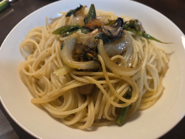 燻製牡蠣と春菊のペペロンチーノ