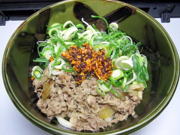 > カトキチの冷凍うどん+すき家の冷凍牛丼の具+桃屋の辛そうで(ry ラー油で、汁なし肉うどん!