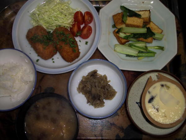 > 12/26の夕食 クリームコロッケ、厚揚げと小松菜炒め、切り干し大根の煮物、茶碗蒸し
