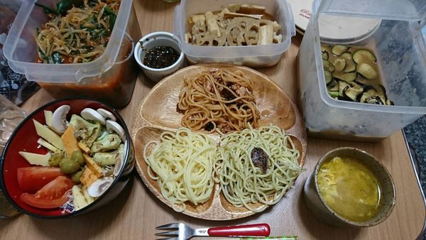 さらだ、韮モヤシのナムル、蓮根と長芋の山葵漬、茄子の山葵漬、にんにくと卵スープ