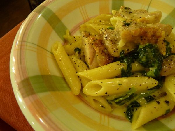> 香川県三木町にある「パスタの店 山猫軒」。ローストチキンとほうれん草のチーズクリームペンネ(小盛り)。