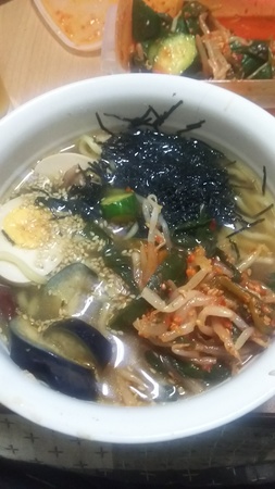 > 味玉、もやしときぅりの辛い和え物、自家製ちやしゅーらめーん