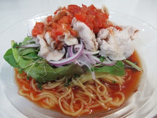 今日の麺料理はトマト嫌いの方は閲覧注意の冷たい麺「トマトだれの豚しゃぶ冷やし中華」です