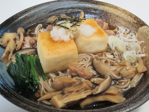 今日の麺料理は自家製厚揚げを冷たいお蕎麦にのせてきのこと鶏肉のあんをたっぷりかけていただく「揚げ出し豆腐のきのこあんかけそば」