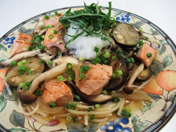 秋らしいスープパスタ、「鮭ときのこのスープパスタ」です