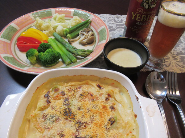 突然思い立ってスーパーで食材を買い込んで作ったのが「茹で野菜のバーニャカウダとエビマカロニグラタン」