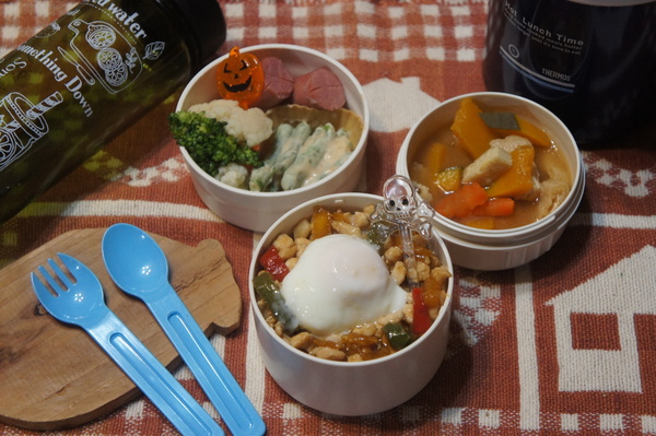長男のリクエストで温泉玉子のせガイガパオ丼&具沢山お味噌汁弁当