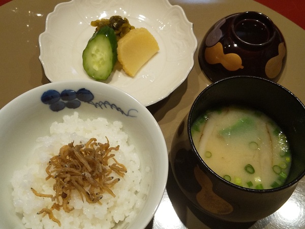 ちりめんじゃこにすぐきの漬物、白味噌の味噌汁と京都らしい感じ