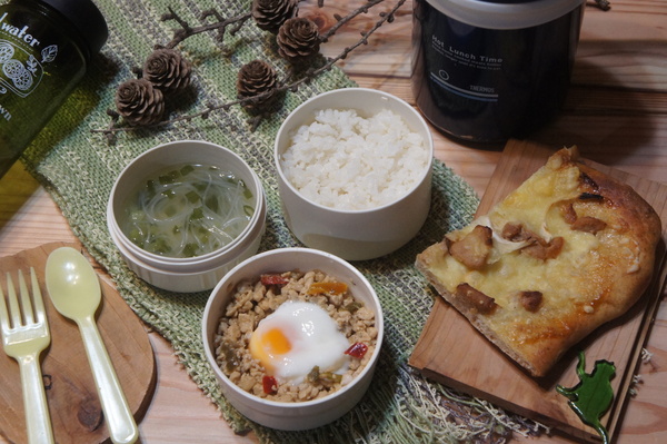 > ガパオライス&春雨スープ&朝食の残りの照り焼きチキンピザ弁当