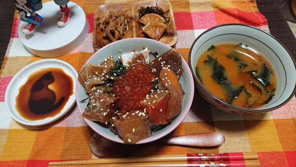 3日漬けたお魚と大葉 胡麻 いくらを乗せる