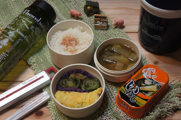 長男考案の献立で玉子焼き&茹で白菜&魚の缶詰弁当de長男のランチ