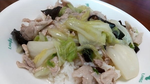 白菜、豚肉、きくらげ。味付けは味覇のみ。とろみを付けてご飯にON。旨い。