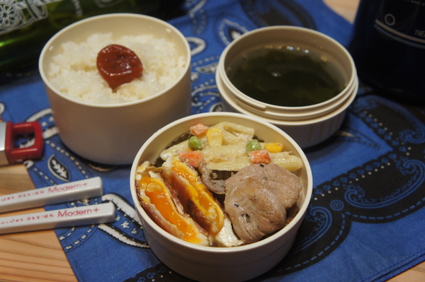 豚肉のレモンペッパーソテー&マカロニサラダ弁当de長男のランチ