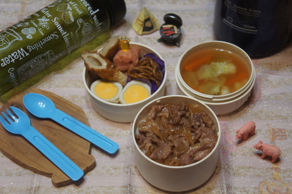> 「豚丼&野菜スープ弁当」de長男のランチ