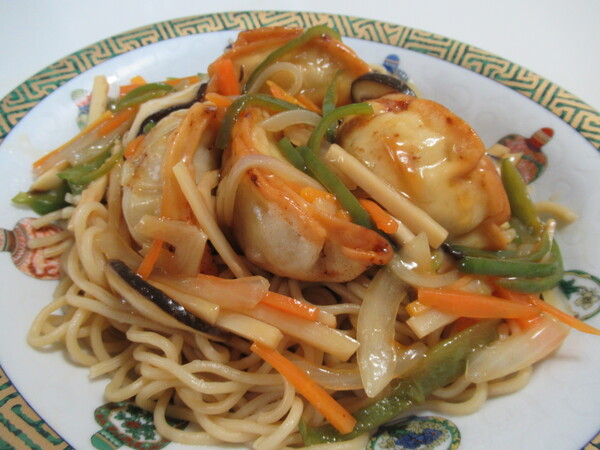 今日の麺料理は「揚げ餃子の甘酢あんかけ焼きそば」です
