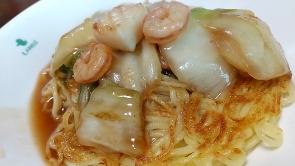 市販の焼きそばをアレンジしました。麺に焦げ目を付けて皿に取り、具を炒めたフライパンに添付の粉末スープを溶かした水100cc。片栗粉でとろみを付けてできあがり。