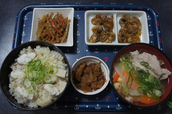 朝ご飯(フグの炊き込みご飯に豚汁等)