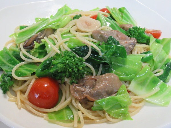 今日の麺料理は春らしく「牡蠣のオイル漬けと春野菜のアンチョビパスタ」です
