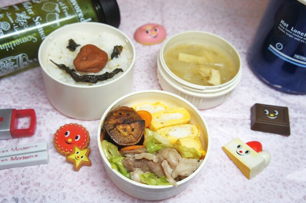 > 豚肉とキャベツのハーブソルト風味&大学芋もどき弁当de長男のランチ