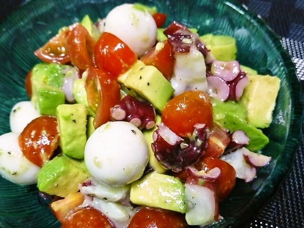 タコとアボカドとミニトマトとうずらの玉子のサラダ