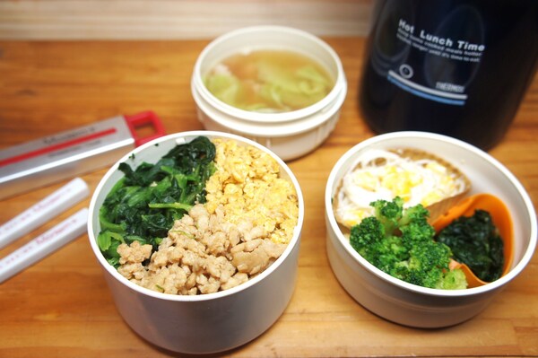 > 長男が献立を考えて作り、盛り付けまでした3色そぼろ丼&春雨サラダ弁当
