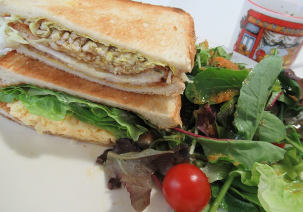 今日の朝食は「チーズハムカツとスクランブルエッグのトーストサンド」です