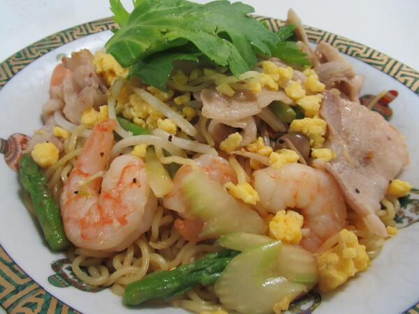 今日の麺料理は「エビとセロリのエスニック焼きそば」です