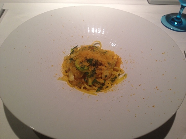 毛蟹と根セロリの冷製生スパゲッテーニと削りたてカラスミパウダー。