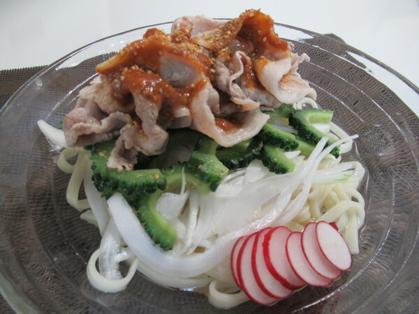 今日の麺料理は「豚しゃぶとゴーヤの味噌だれうどん」です