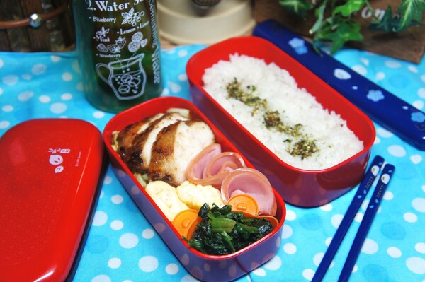 鶏肉のめんつゆマヨ炒め&ホウレン草のおひたし弁当de長男のランチ