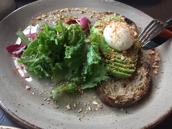ビーツとアボカドのオープンサンド 。日光御養卵のポーチドエッグ。
