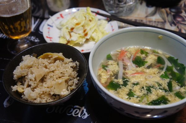 > ワラビと筍の炊き込みご飯&三つ葉入りかき玉汁