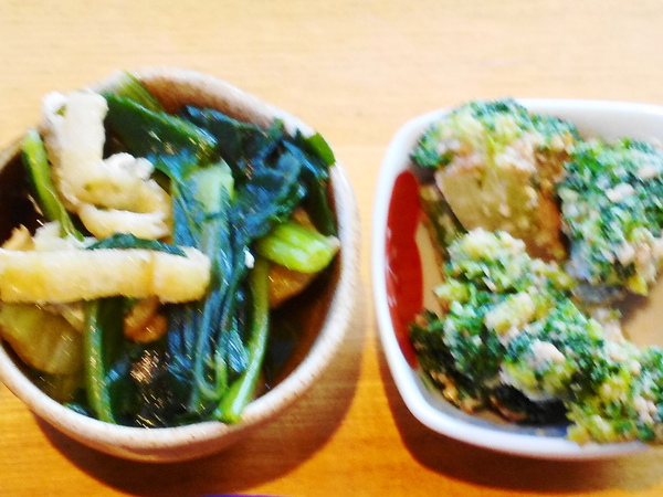 青菜とお揚げさんの炊いたんとブロッコリーの胡麻和え