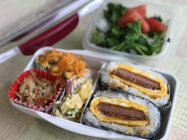 ポーク玉子おにぎり、人参しりしり
