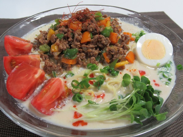 今日の麺料理は「彩り肉味噌の冷やし豆乳担々麺」です