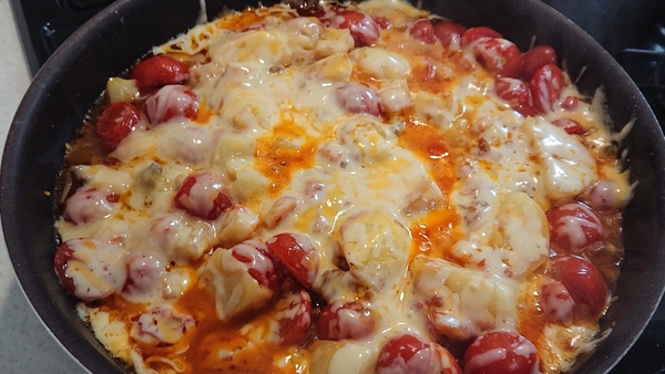 > チーズたっぷり♬じゃがいもとミニトマトの簡単ミートソース炒め♬