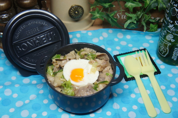 > 目玉焼きのっけ豚肉とキャベツの味噌丼弁当de長男のランチ