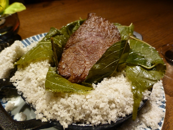 > 桜の葉で包んだ塩釜で作る「ローストビーフ」