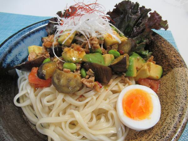 今日の麺料理は「茄子とトマトとアボカドの麻婆炒めのせうどん」です