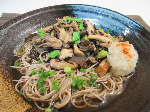 今日の麺料理は「きのことこんにゃくの炒め煮そば」です