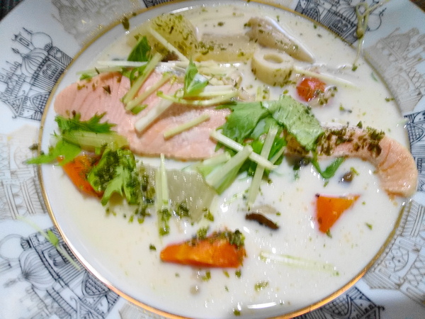 > 鮭と野菜の冷製豆乳スープ