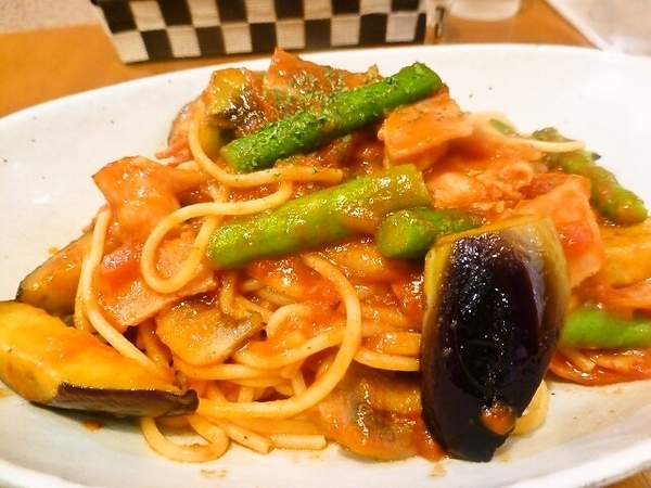 茄子とアスパラとベーコンのトマトクリームスパ♪