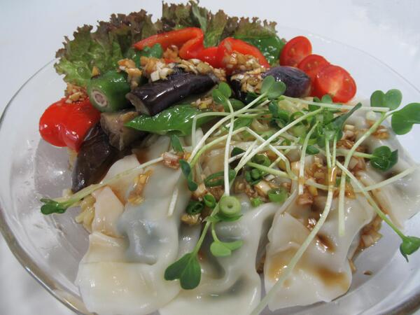 > 夏野菜の素揚げと手作り水餃子の冷やし中華