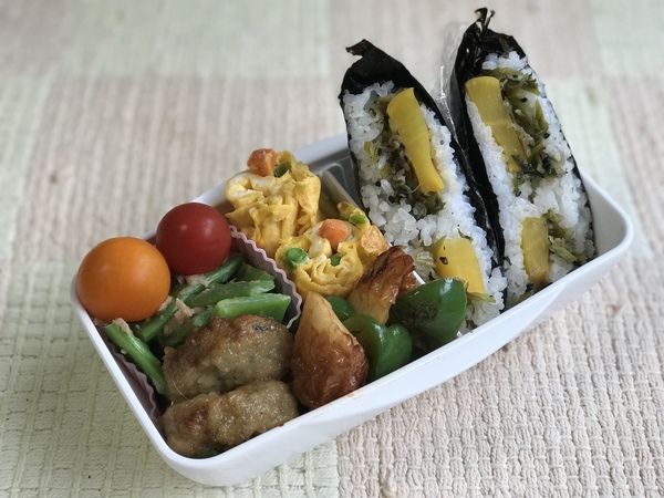 タクアンと蕪菜てジャコの炒め物を入れたオニギラズ