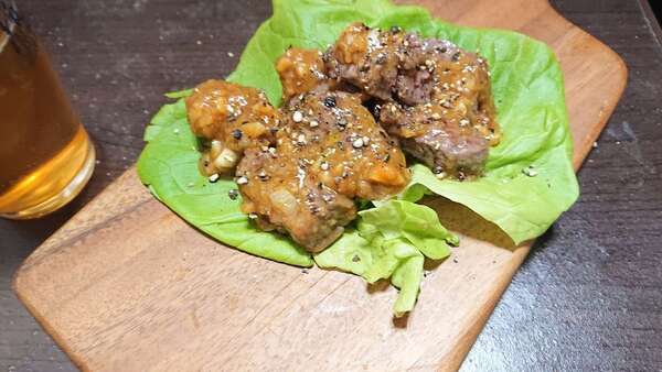 フライパンでサイコロステーキを焼いたら味噌ソースを付けて盛り付け