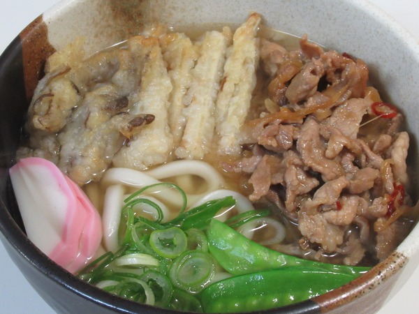 今日の麺料理は「肉ごぼう舞茸天うどん」です