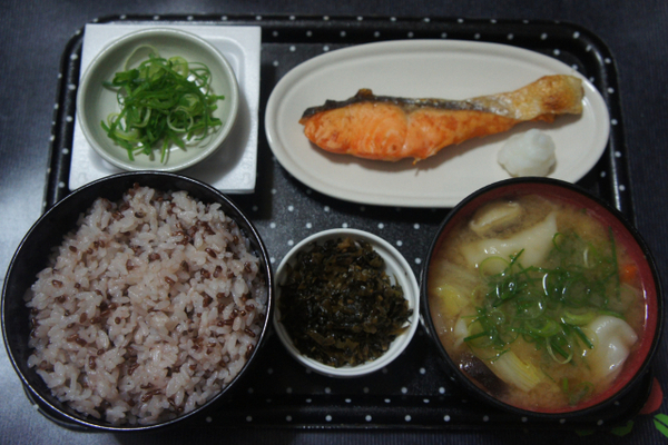 朝ご飯(焼鮭、餃子のみそ汁等)