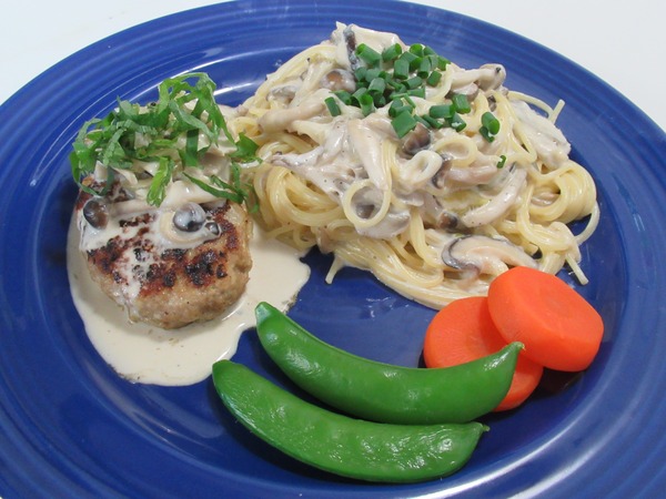 今日の麺料理は「豆腐ハンバーグの和風クリームソースパスタ」